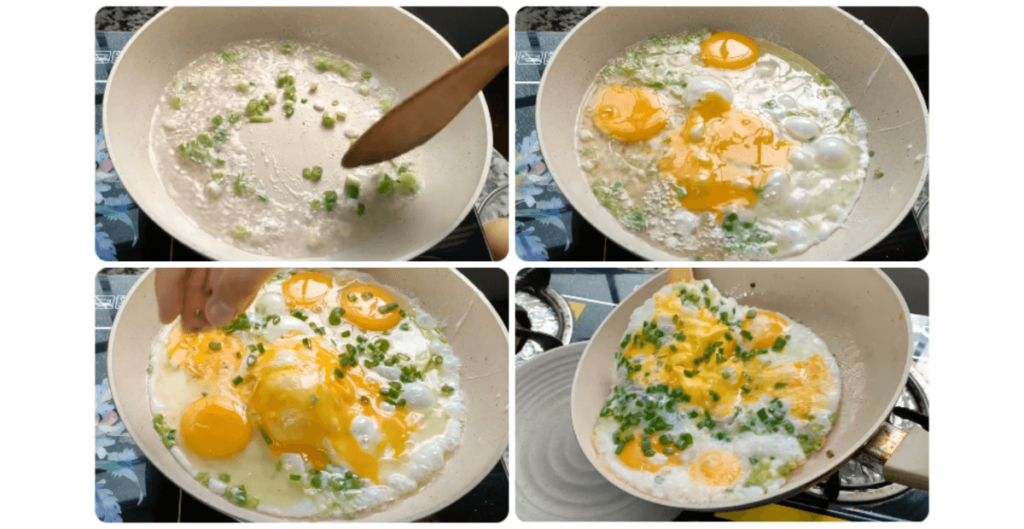 - Đập trứng nhẹ tay vào chảo, không khuấy. Dùng nắp đậy chảo trong 30 – 40 giây để giữ nhiệt, giúp lòng trắng chín đều mà lòng đỏ vẫn lỏng.