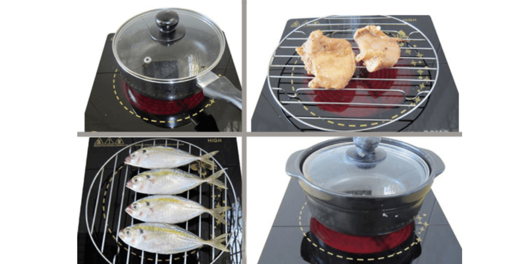 - Vỉ nướng inox chịu nhiệt hoặc khay nướng nhỏ: dùng để đặt thực phẩm lên bếp mà không làm bẩn mặt kính.